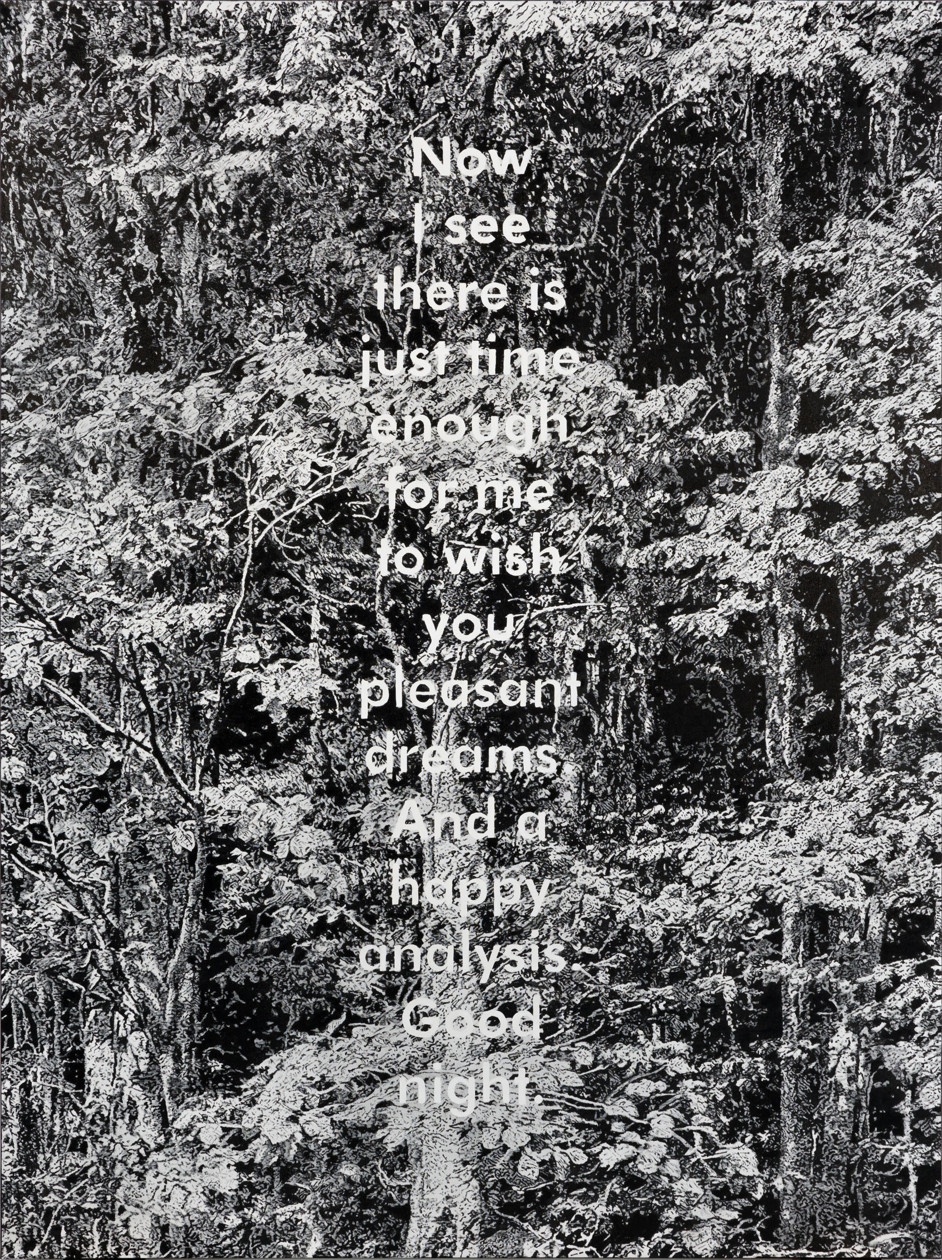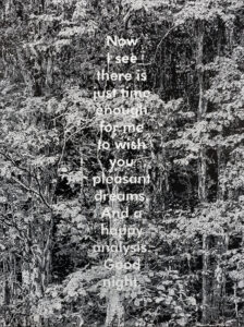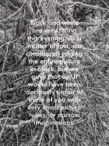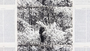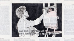 The narrators whose monologues introduce and accompany us through the animated film are the famous film director, the master of suspense, Alfred Hitchcock, and television star and painting instructor Bob Ross. Their drawn characters engage in a unique kind of dialogue with the viewer, asking questions and addressing the camera directly, simultaneously suggesting and disrupting the film’s content: “Have you ever had a premonition? A feeling that something dreadful was about to happen? Today we’re gonna start with white canvas and we’re gonna use some magic black on it….” – these are just some of their lines used in the film.