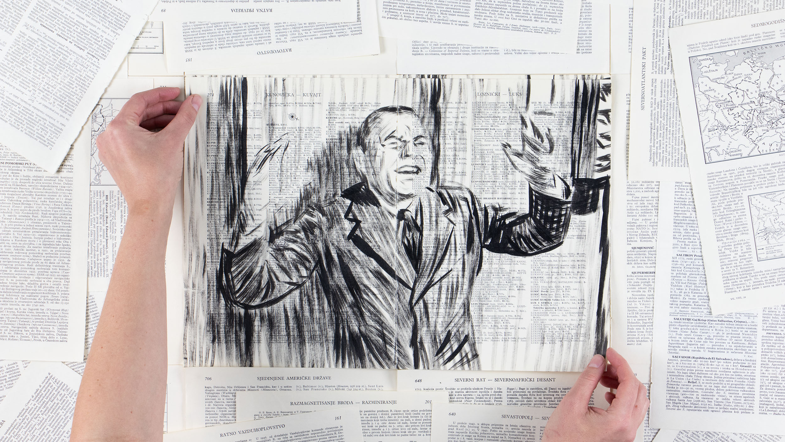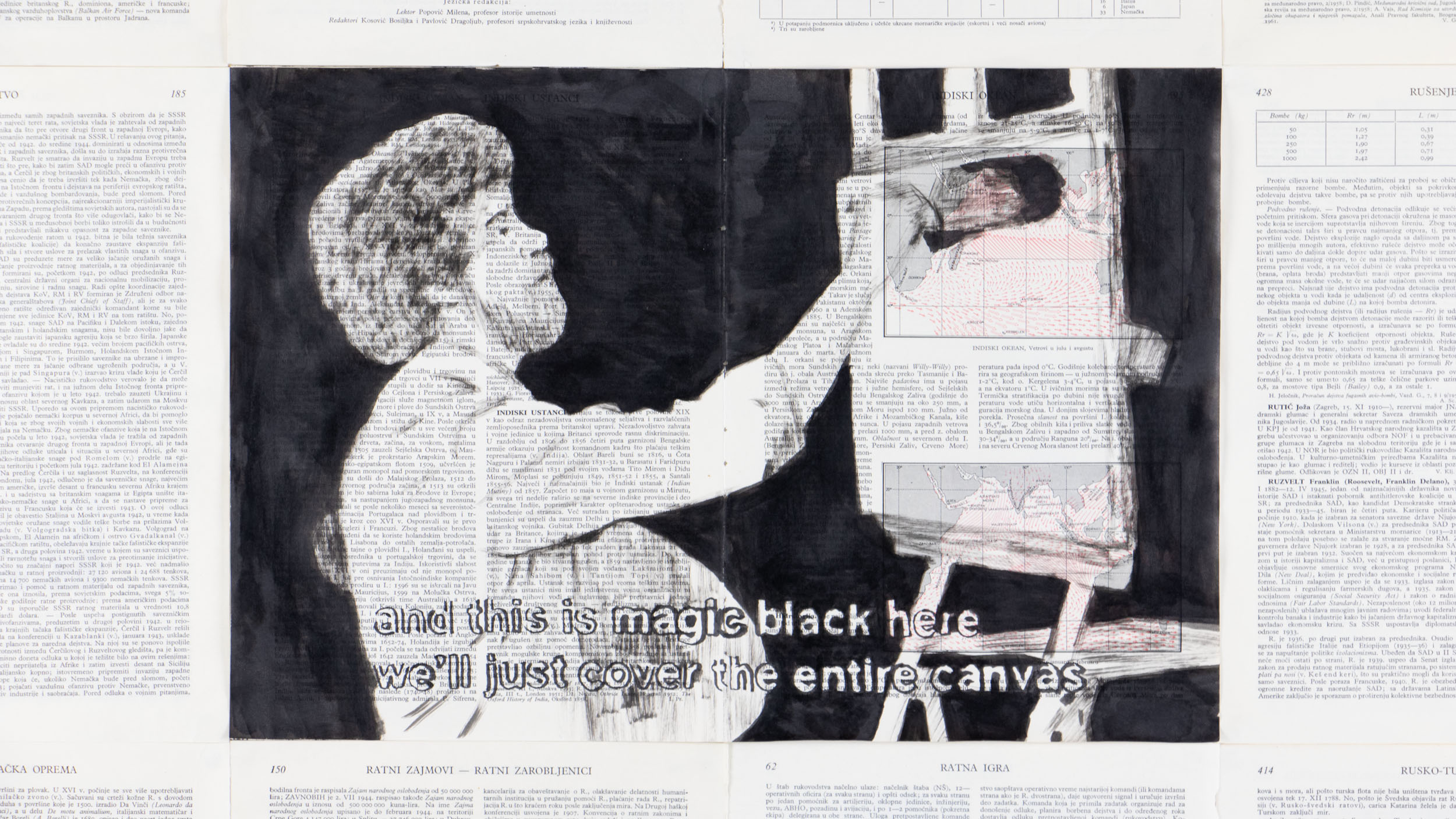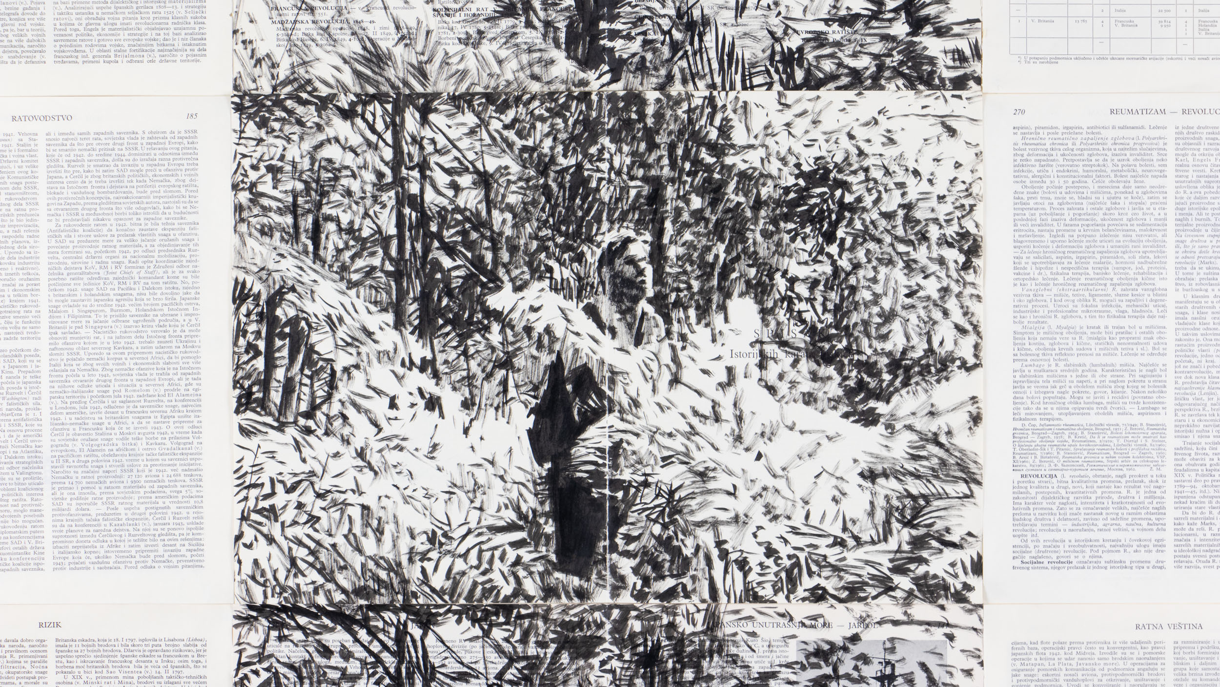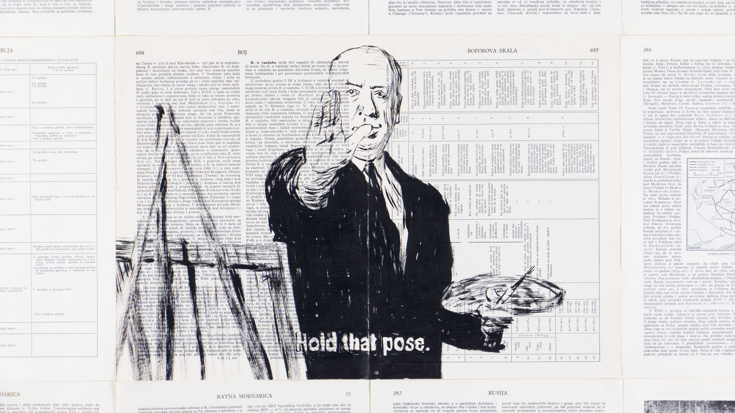 On the pages of the Military Encyclopedia found, which includes twelve extensive, hardbound books printed in the sixties of the twentieth century in FR Yugoslavia, frames and sequences of various science fiction films and horror television series are drawn. The books are sorted alphabetically, record and define the wealth of militant terms, the historical development of the military industry, kinds and types of weapons, as well as approaches to air, land and sea forms of warfare.